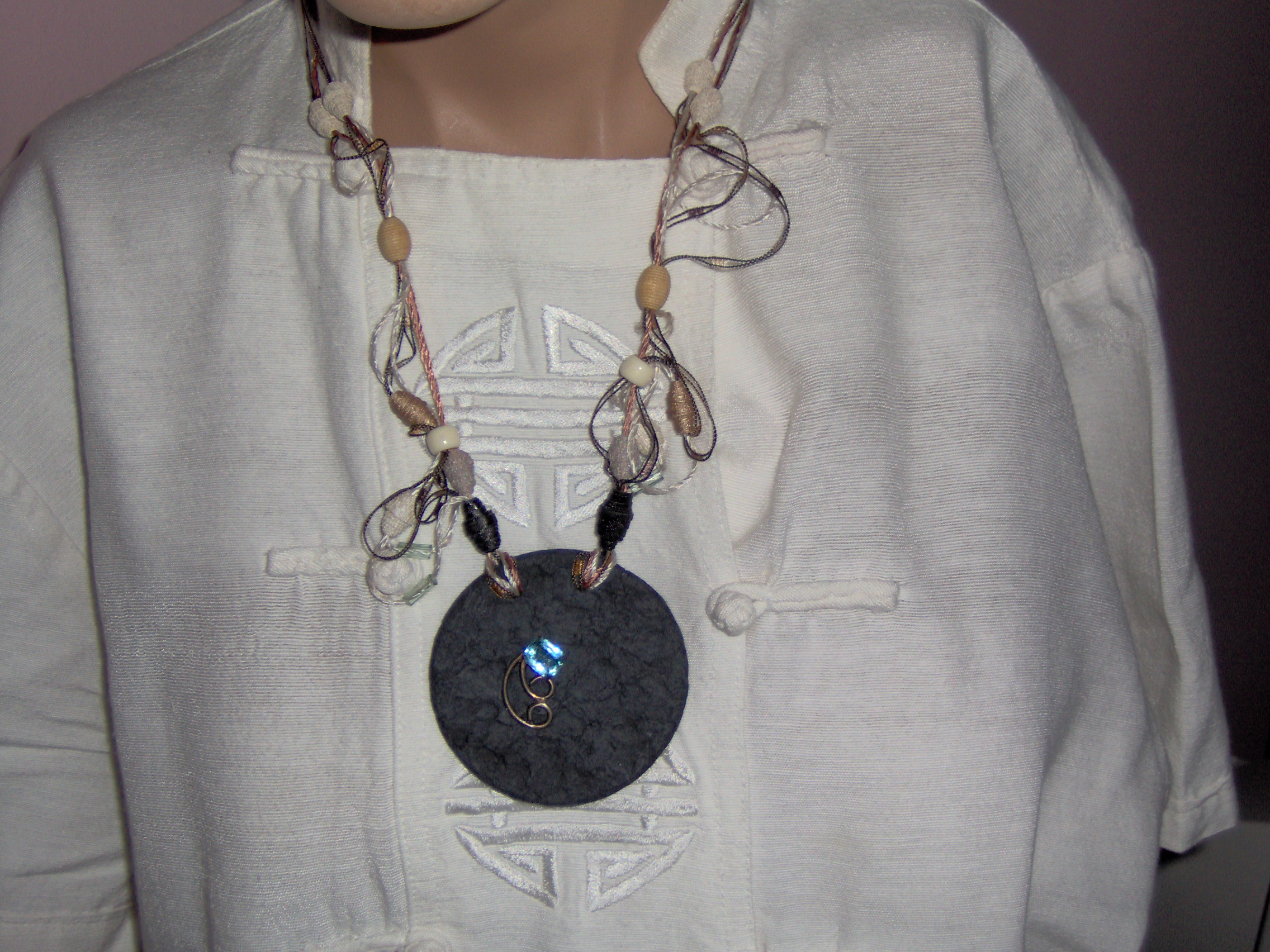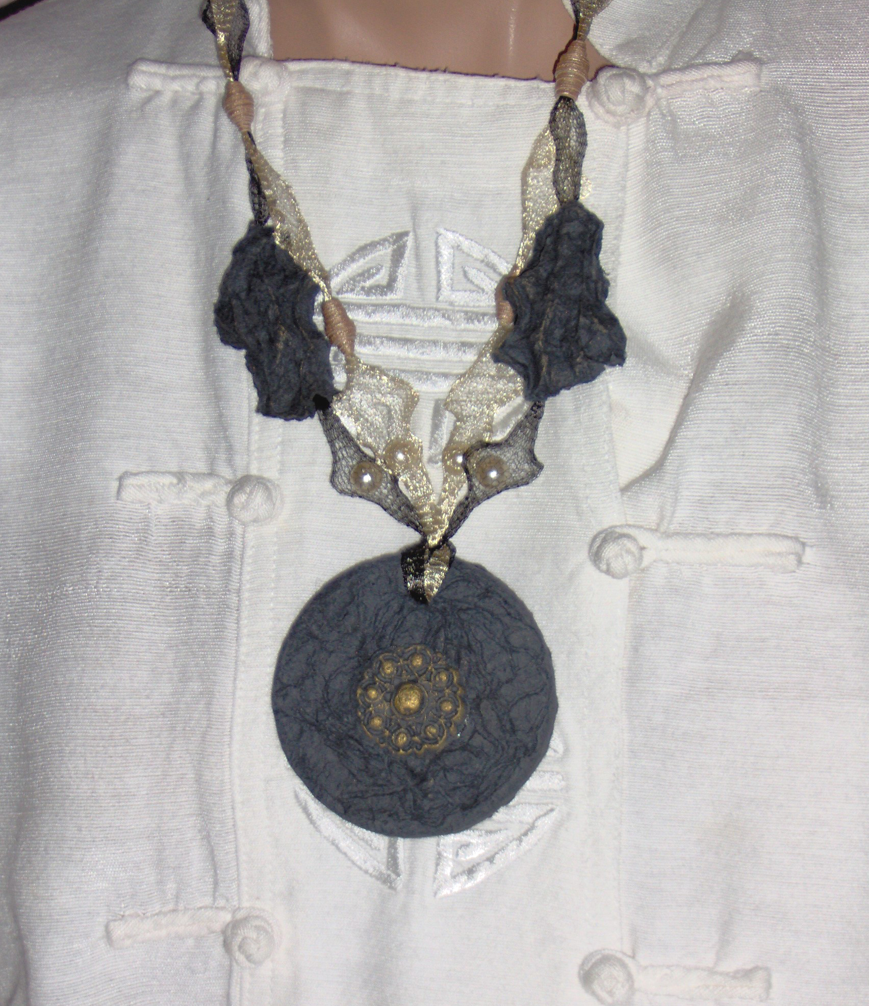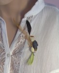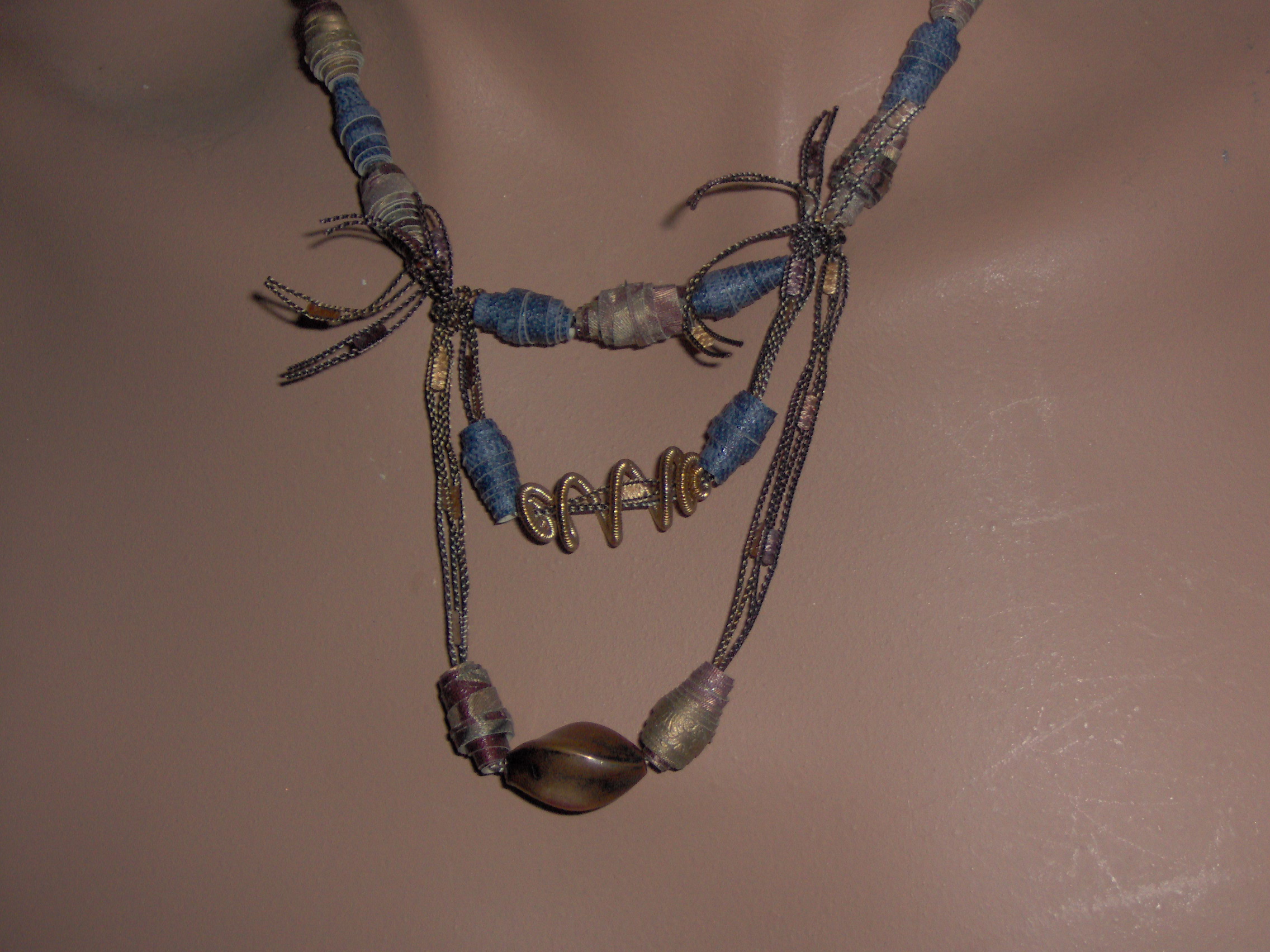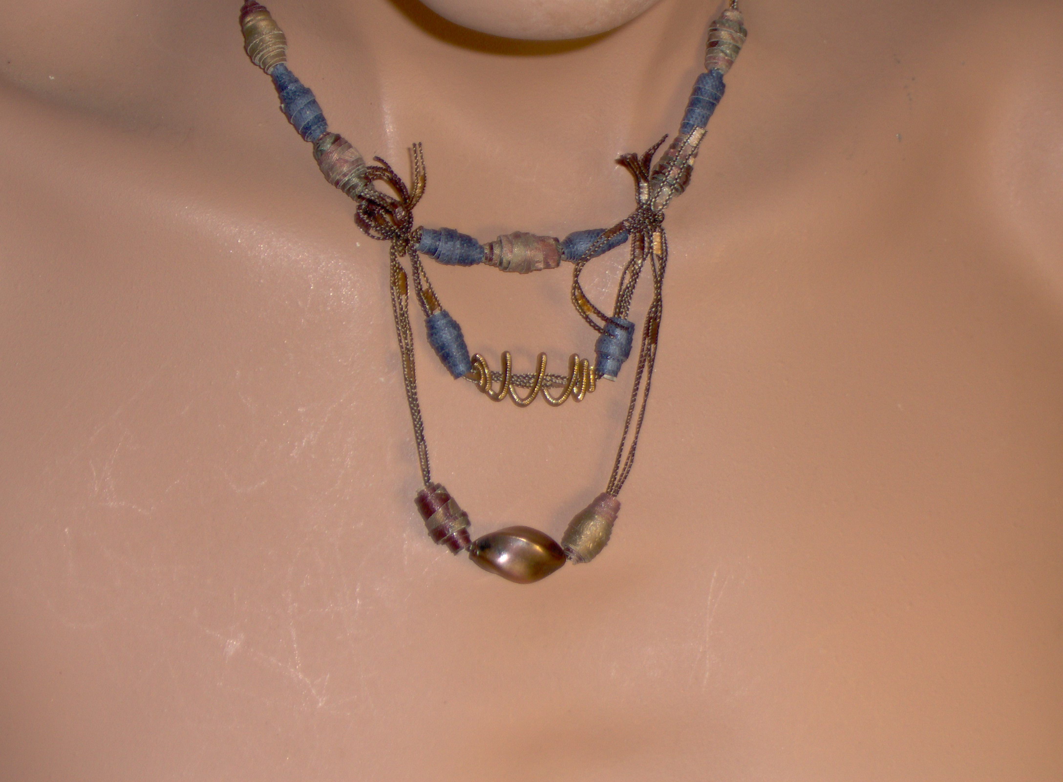 Conçu et réalisé par l’artiste, chaque bijou est fabriqué séparément à la main. Les perles de papier roulé, les éléments de pulpe moulée et les rubans précieux en font une œuvre unique et originale. Parure à la mesure de votre fantaisie.
